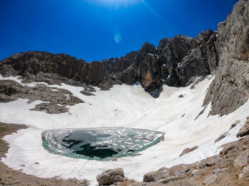 Nurhak Dağları’nın 2 bin 500 metre yüksekliğinde bulunan buzul krater gölü doğallığının yanı sıra kenarında bulunan mağaralar dikkat çekiyor.