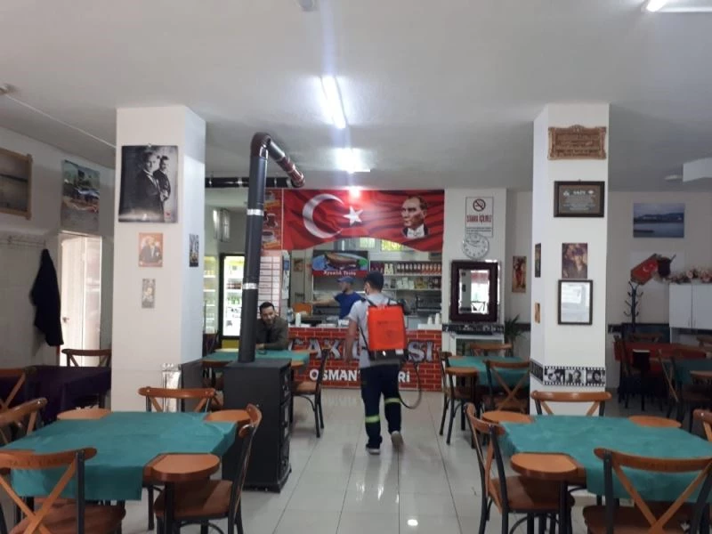 Aliağa Belediyesi, normalleşme süreciyle yeniden açılan işletmelerde dezenfekte çalışmalarını sürdürüyor.