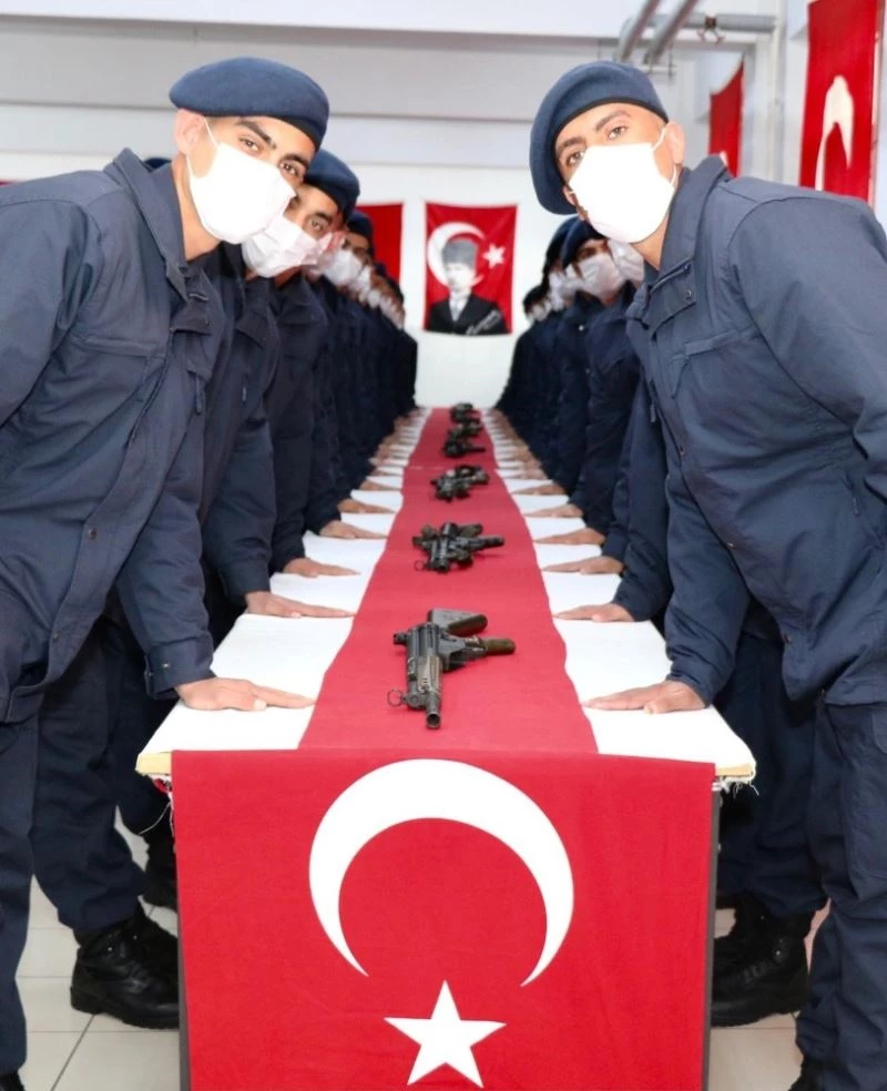 İzmir İl Jandarma Komutanlığına bağlı Aliağa Cezaevi Jandarma Tabur Komutanlığında kısa dönem acemi eğitimini tamamlayan 82 er için yemin töreni düzenlendi.