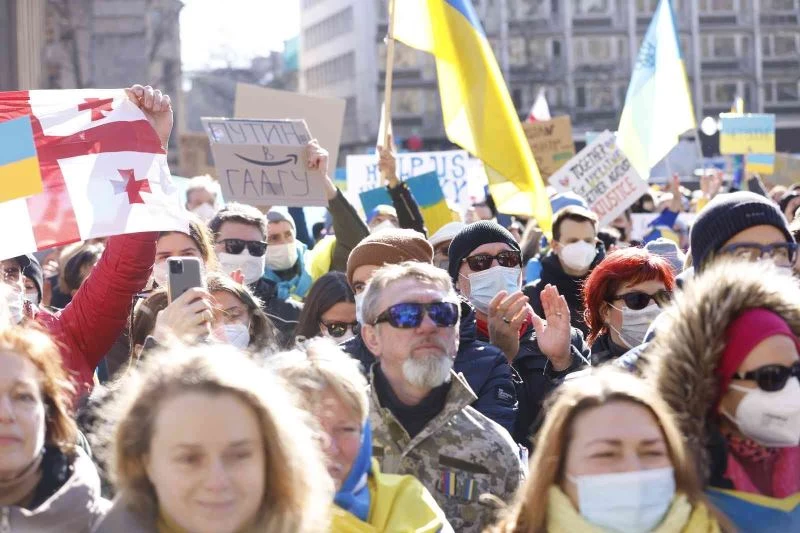 Ukrayna Milli Marşı’nın okunması ile başlayan protestoda, siyasi parti temsilcileri ve sivil toplum kuruluşu temsilcilerinin yaptığı konuşmalarda, Rusya’nın Ukrayna topraklarından çekilmesi gerektiğine değinilirken, AB ülkelerinin Ukrayna’ya daha fazla yardım yapması talep edildi.