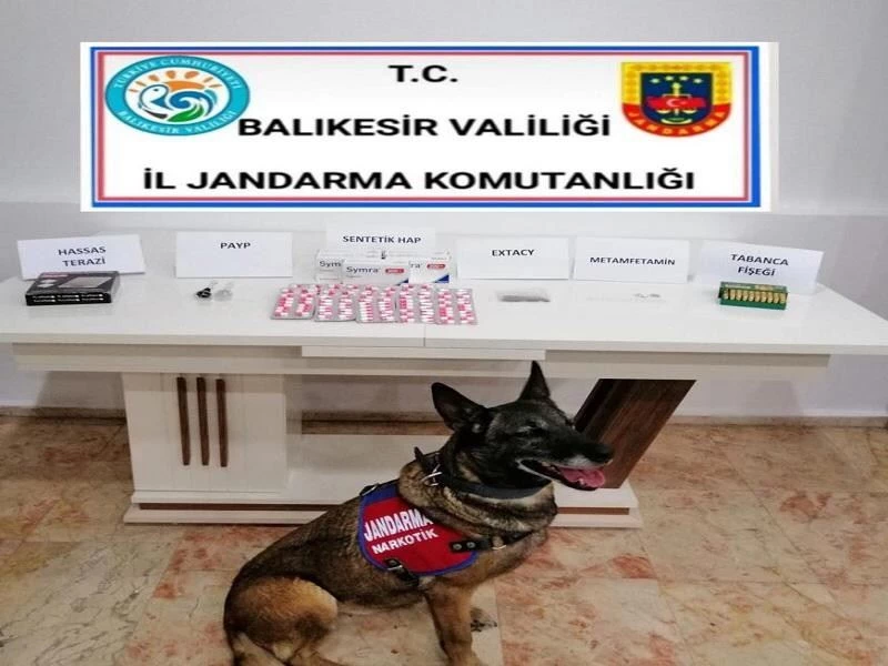 Balıkesir İl Jandarma Komutanlığınca uyuşturucu madde imal ve ticaretine yönelik yapılan istihbari çalışmalar neticesinde, Altıeylül İlçesinde uyuşturucu madde bulundurduğu ve ticaretini yaptığı tespit edilen Ö.K., M.A. ve F.A. isimli şüphelilerin üzerleri ve ikametinde yapılan aramalarda; 427 adet sentetik uyuşturucu hap, 37 adet extacy, 6 gram metamfetamin, 50 adet tabanca fişeği, 1 adet hassas terazi ve 2 adet uyuşturucu kullanma aparatı (payp) ele geçirildi. Cumhuriyet Savcılığının talimatı ile ele geçirilen malzemelere el konularak, şüpheliler hakkında adli tahkikata başlanıldı.