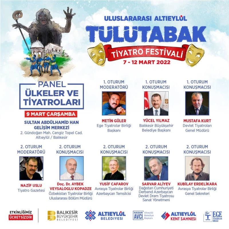 Uluslararası Altıeylül Tülütabak Tiyatro Festivali’ne ülke içinden Şanlıurfa, Diyarbakır, Bursa, Ankara, İstanbul ve İzmir Şehir Tiyatroları’nın oyuncuları ile birlikte Ege Tiyatrolar Birliği’ne üye 63 tiyatro temsilcisi ve Avrasya Tiyatrolar Birliği’nin temsilcileriyle başkanları da katılım sağlarken, ülke dışından ise Azerbaycan, Özbekistan ve Dağıstan Cumhuriyeti’nden değerli sanatçılar da yer alacak. Yetişkin ve çocuk tiyatrolarının tiyatroseverler ile buluşacağı Uluslararası Tülütabak Tiyatro Festivali’nde ayrıca atölyeler ile “Ülkeler ve Tiyatroları” isimli panel de yer alacak.