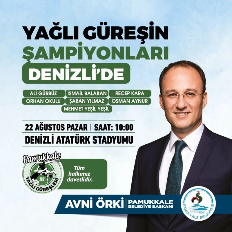 Pamukkale Belediyesi önemli bir organizasyona ev sahipliği yapmaya hazırlanıyor. “Pamukkale Yağlı Güreşleri” 22 Ağustos 2021 tarihinde Atatürk Stadı’nda gerçekleşecek. Pamukkale Belediye Başkanı Avni Örki, ülkenin altın kemerli pehlivanlarının katılacağı organizasyona tüm Denizli’yi davet ederek, “Bu spor etkinliğimize önemli pehlivanlar katılacak. Şampiyonların buluştuğu bir organizasyon olacak” dedi.