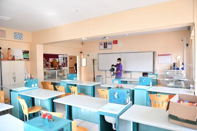 Altınordu Belediyesi ekipleri yüz yüze eğitim dönemi öncesi şehirde bulunan tüm okullarda yeniden hummalı bir çalışma başlattı. Belediye ekipleri okul içerisinde bulunan sınıflar başta olmak üzere, öğrencilerin ve öğretmenlerin temas edebileceği tüm ortak kullanım alanlarını detaylı bir şekilde özenle dezenfekte ediyor.