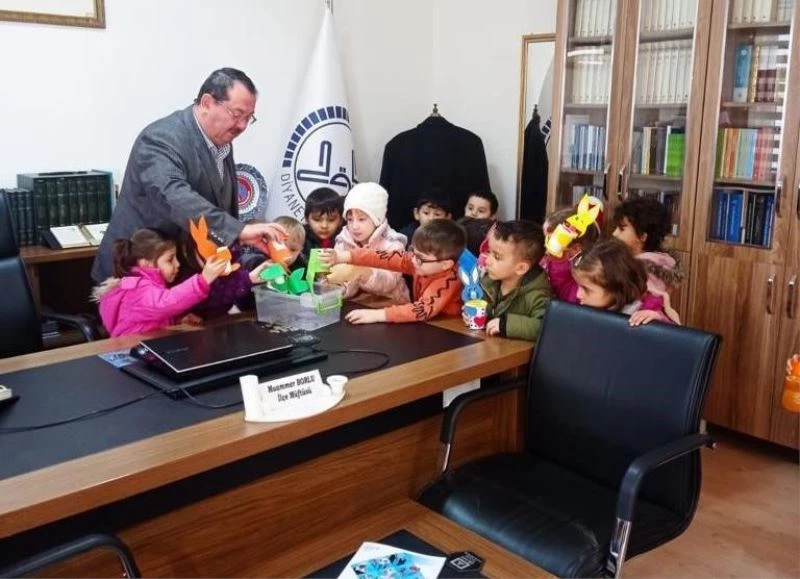 İlçedeki 4-6 yaş kuran kursunda öğrenim gören 15 öğrenci Müftü Muammer Borlu’yu ziyaret ederek kumbaralarındaki harçlıklarını deprem bölgesine gönderilmesi için TDV’ye bağışta bulundular.