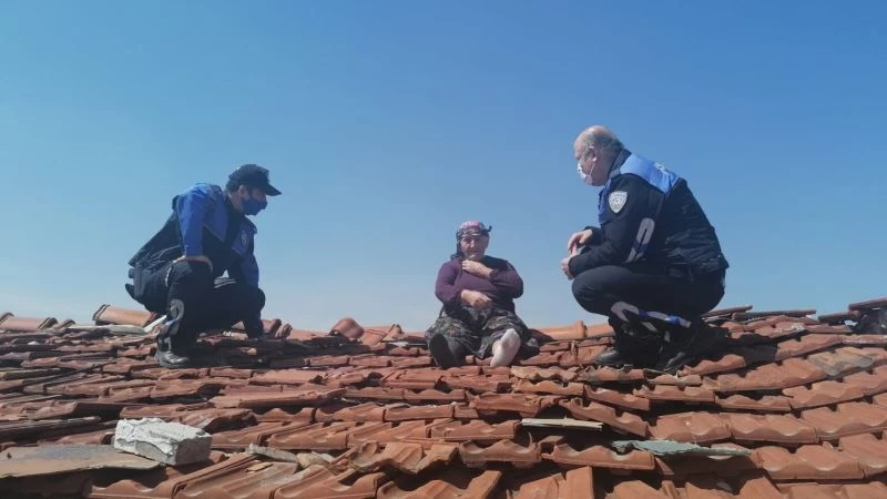 Polisi karşısında gören Safiye Çayır, çatının sızdırdığını söyleyerek, kiremitleri düzenlemek için çatıya çıktığını söyledi. Polis ekipleri yaşlı kadını ikna etmek için dakikalarca dil döktü. Polisin ikna için dil döktüğü anlar amatör kameraya yansıdı.