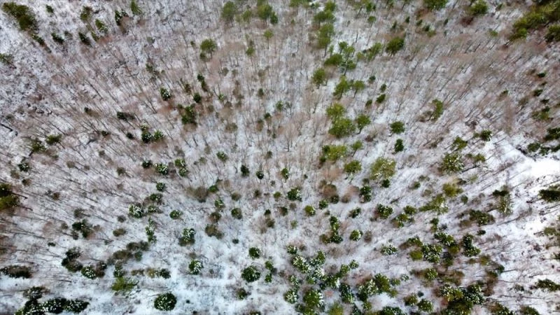 Amanoslarda 1650 metre rakımda yer alan Zorkun Yaylası'nın zirveye yakın kesimlerinde toprağı ve çam ağaçlarının üstünü kaplayan kar, drone ile havadan görüntülendi.