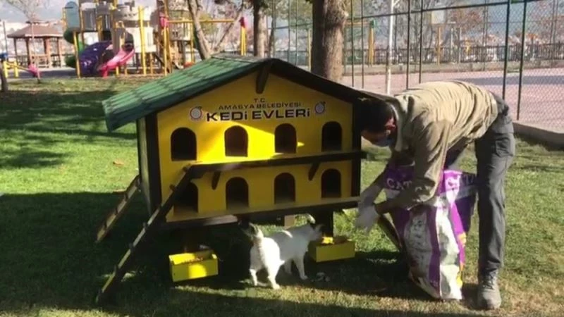 Amasya Belediyesi ekipleri sokağa çıkma kısıtlaması nedeniyle kedi, köpek ve kuşların aç kalmaması için sokaklarda mama ile yem bıraktı.