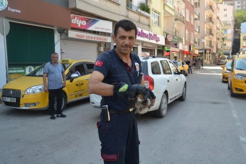 Amasya’nın Yüzevler Mahallesi’nde sabah saatlerinde kedi sesi duyan taksi şoförü kaputunu açtığında kedinin motor kısmına girerek burada sıkıştığını gördü. Kediyi bulunduğu yerden çıkaramayan taksi şoförü durumu Amasya Belediyesi İtfaiye Müdürlüğüne bildirdi. İtfaiye ekipleri zaman kaybetmeden olay yerine gelerek, yavru kediyi sıkıştığı yerden çıkardıkları sırada, yavru kedi ellerinde kaçarak 5 ayrı aracın motor kısmına daha kaçtı. İtfaiye ekipleri uzun süren çabalar sonunda kediyi kurtardı. Sakinleşen yavru kedi, Amasya Belediyesi Hayvan Barınağı yetkililerine teslim edildi.