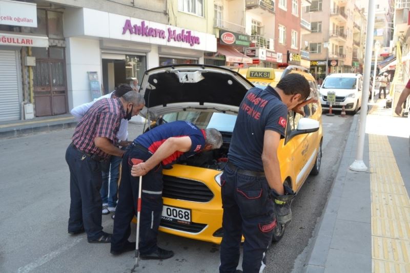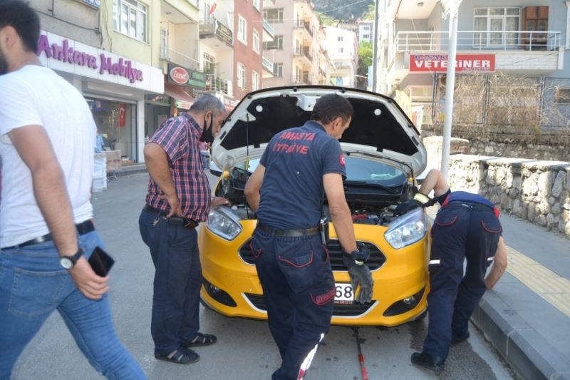 Amasya’da bir taksi durağına ait ticari taksinin motor kısmına giren kedi, başka araçların motorlarına da kaçınca, itfaiye ekipleri zor anlar yaşadı.
