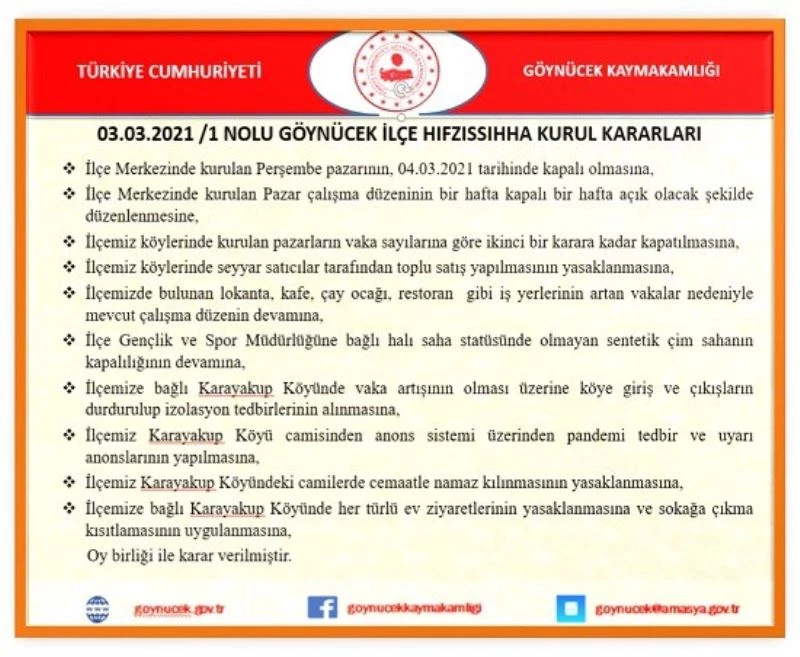 Göynücek Kaymakamlığı’ndan yapılan yazılı açıklamada, "İlçemize bağlı Karayakup köyünde vaka artışının olması üzerine köye giriş ve çıkışların durdurulup izolasyon tedbirlerinin alınmasına, her türlü ev ziyaretlerinin yasaklanmasına ve sokağa çıkma kısıtlamasının uygulanmasına karar verilmiştir" denildi.