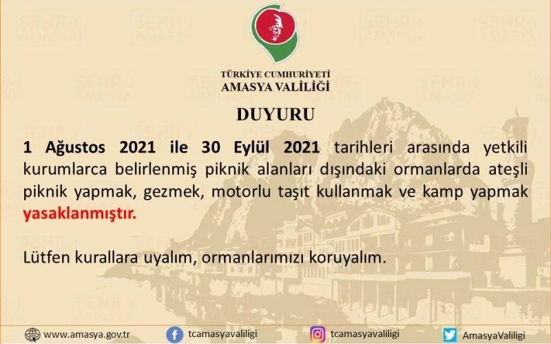Amasya Valiliği’nden yapılan açıklamada orman yangılarının önlenmesine yönelik tedbirler kapsamında yetkili kurumlarca belirlenmiş piknik alanları dışındaki ormanlarda ateşli piknik yapmak, gezmek, motorlu taşıt kullanmak ve kamp yapılmasının 2 ay süreyle yasaklandığı bildirildi.