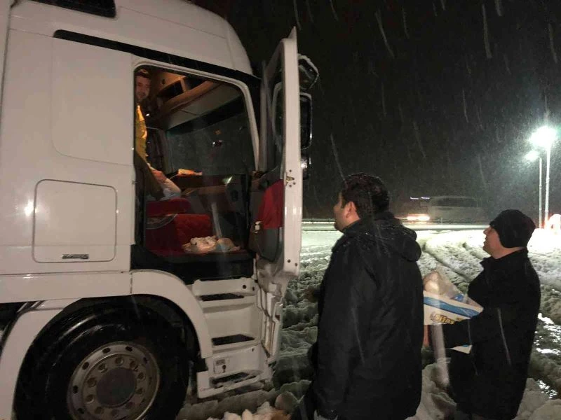 Amasya’nın Taşova ilçesinde, Kaymakam Ahmet Gökcecik ve polis ekipleri kar yağışı ve tipi nedeniyle yolda mahsur kalan tır sürücülerine kumanya dağıttı.