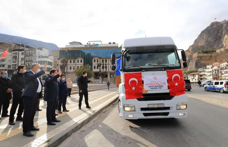 Amasya’dan İzmir’deki depremzedeler için düzenlenen kampanya kapsamında hazırlanan gıda kolisi ve battaniye yardımlarını içeren tır dualarla uğurlandı.
