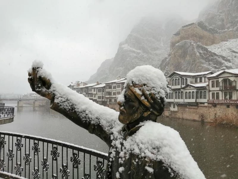 Kentin yüksek kesimleri, binaların çatıları ve yeşil alanlar da beyaz örtüye büründü. Kartpostallık görüntülerin oluştuğu kentte selfie yapan şehzade heykelinin üstü de karla kaplandı.