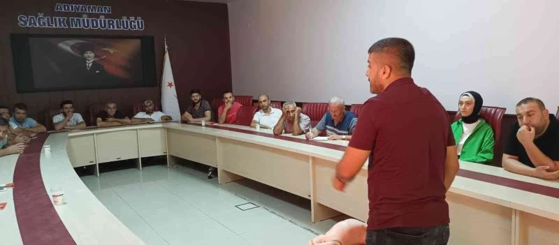 Adıyaman İl Ambulans Servisinde şoför olarak görev yapan 20 kişiye, teorik olarak bebek, çocuk ve erişkinlerde temel yaşam desteği, üst havayoluna kaçan yabancı cismi çıkarma, kanamalı hastaya yaklaşım, göğüs ağrısı ve kalp krizinde ilk yardım, düşük kan şekeri, dış kanamalar, kırık ve çıkıklar, donma, sıcak çarpması, hayvan ısırıkları, yaralı taşıma gibi konular anlatıldı.
