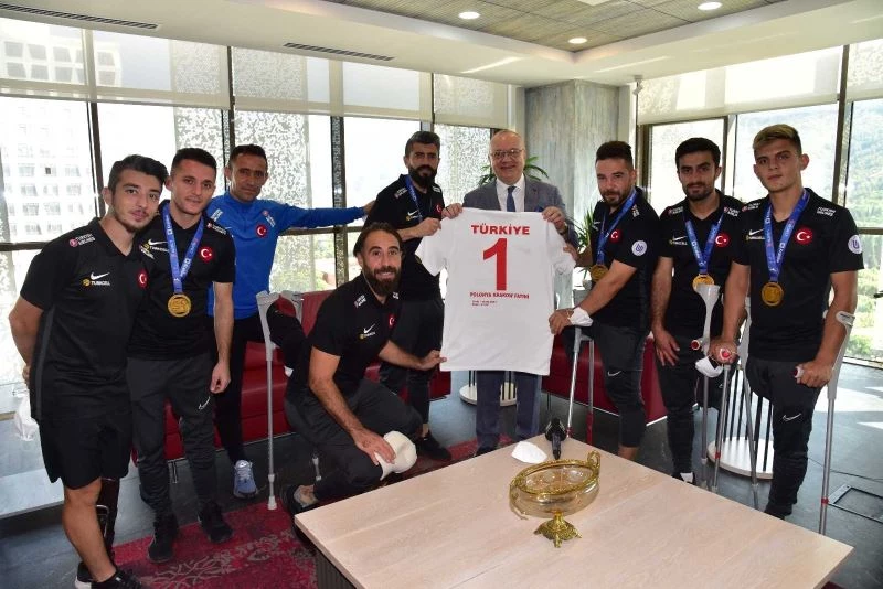 Ampute Milli Futbol Takımı, kamp yaptığı otelde kendilerini ziyaret eden Manisa Büyükşehir Belediye Başkanı Cengiz Ergün’e, Avrupa Şampiyonası’nda şampiyonluk sözü vermişti. Kazanılan bu büyük zaferin ardından Ampute Milli Futbol Takımı ve Teknik Direktör Osman Çakmak, Manisa Büyükşehir Belediye Başkanı Cengiz Ergün’ü ziyaret ederek, şampiyonluk sevincini paylaştı. Ziyarette, Manisa Büyükşehir Belediyespor Kulüp Başkanı Mehmet Güzgülü, Manisa Büyükşehir Belediyesi Genel Sekreter Yardımcısı Uğur Başkal, Basın Yayın ve Halkla İlişkiler Dairesi Başkanı Göksel Topçu yer aldı. Başkan Ergün, sporcuları tek tek kutlayarak, ‘Yüzüncü Yılında Milli Mücadele Döneminde Manisa’, Mesir Macunu ve Cumhuriyet altını hediye etti. Ampute Milli Futbol Takımı Teknik Direktörü Osmak Çakmak ve sporcular da futbolcuların isimlerinin yazılı olduğu ay yıldızlı forma hediye etti.