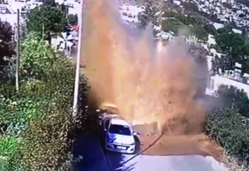 Muğla’nın Bodrum ilçesinde ana su hattı borusunun bomba gibi patladığı anlar güvenlik kamerasına yansıdı. Patlamanın etkisiyle asfaltlar yerinden sökülürken, 2 araçta maddi hasar oluştu.