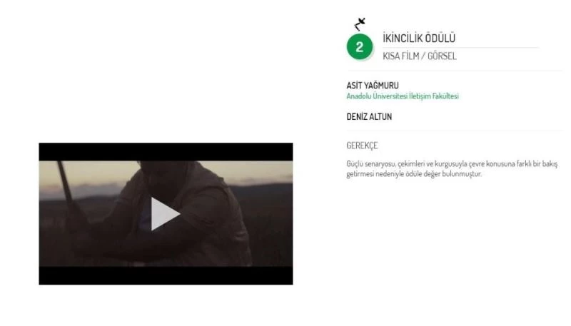 Anadolu Üniversitesi öğrencisi Deniz Altun, 31. Türkiye Gazeteciler Cemiyeti Aydın Doğan Genç İletişimciler Yarışması’nda “Kısa Film” kategorisinde ikincilik ödülü kazandı.