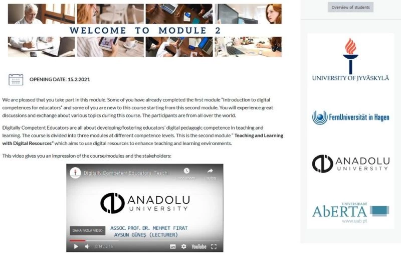 Yükseköğretimde mikro-kredilendirmeye dayanan proje, dijital eğitim yeterlikleri kazandırma programı, öğretme ve öğrenmede dijital yeterlilikleri geliştirmeyi hedefliyor. Dijital Eğitim Yeterlikleri Kazandırma Programının ilk modülü, Almanya’dan Fern Üniversitesi, ikinci modülü Anadolu Üniversitesi ve üçüncü modülü Portekiz’den Aberta Üniversitesi tarafından geliştirildi. Programın ikinci modülü olan Teaching and Learning with Digital Resources modülü, Anadolu Üniversitesi öğretim elemanları Doç. Dr. Mehmet Fırat ve Öğr. Gör. Aysun Güneş tarafından geliştirildi.