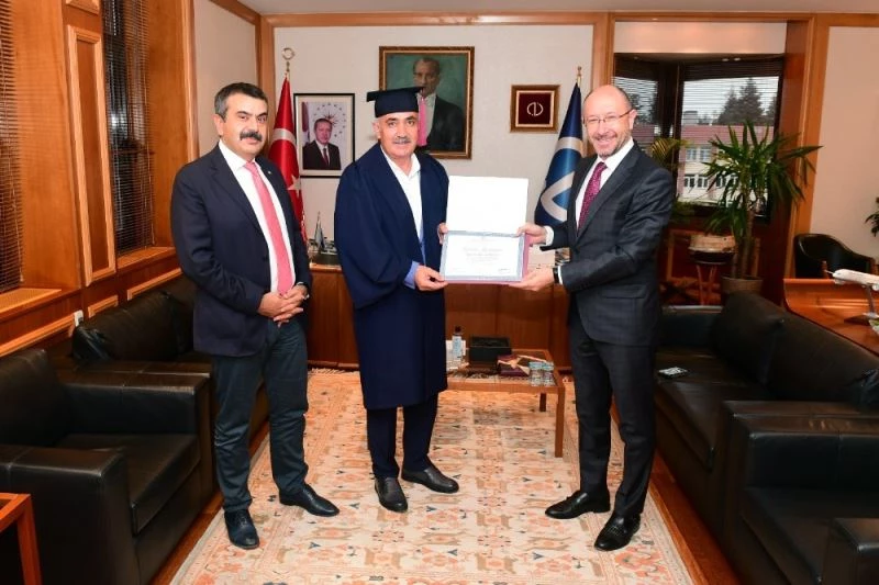 Diğer bir ziyarette ise Anadolu Üniversitesi Rektörü Prof. Dr. Fuat Erdal, Hacı Bayram Veli Üniversitesi Rektörü Prof. Dr. Yusuf Tekin ve AK Parti eski Milletvekili Erdoğan Özegen’i makamında ağırladı. Gerçekleşen ve üniversiteler arası olası iş birliklerinin konuşulduğu görüşmede, Rektör Tekin ve eski Milletvekili Özegen hayırlı olsun dileklerini ileterek, Prof. Dr. Fuat Erdal’a yeni görevinde başarılar diledi. Kamu kurumları, özellikle de üniversiteler arasında kurulacak iş birliklerinin şehre ve ülkeye sağlayacağı katkıların önemine dikkat çeken Rektör Erdal, nazik ziyaretlerinden dolayı Rektör Tekin ve Özegen’e teşekkürlerini iletti. Ziyarette Erdoğan Özegen, yeni mezun olduğu Anadolu Üniversitesi Kamu Yönetimi Bölümü diplomasını Rektör Erdal’ın elinden aldı. Rektör Erdal, kep ve mezuniyet cübbesini giydirdiği Özegen’e diplomasını takdim ederek, başarılar diledi. Ziyaret, fotoğraf çekiminin ardından sona erdi.