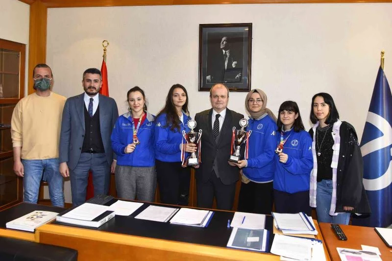 Anadolu Üniversitesi Taekwondo Takımı sporcuları kazandıkları Türkiye üçüncülüğü kupalarını, SKS Daire Başkanı Galip Özsarı eşliğinde Anadolu Üniversitesi Rektör Yardımcısı Prof. Dr. Fatih Temizel’e takdim etti.