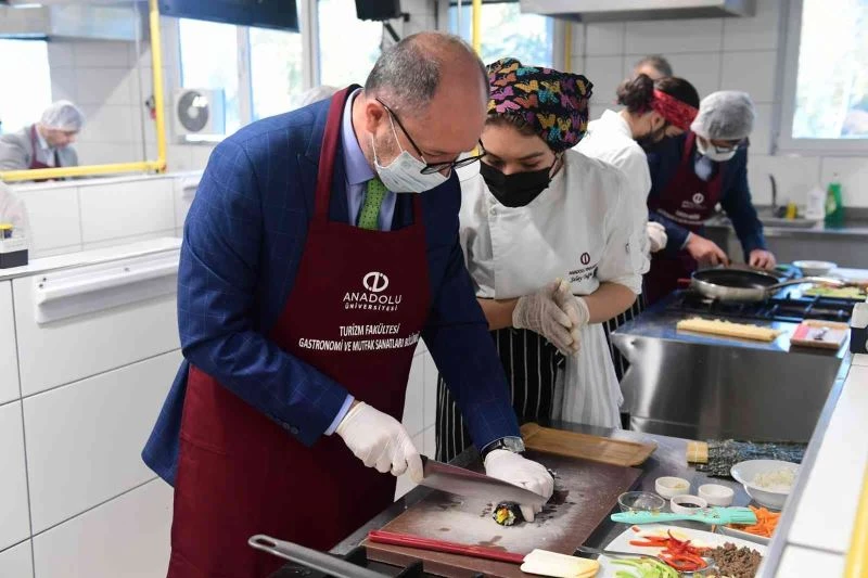 Turizm Fakültesi Gastronomi ve Mutfak Sanatları Bölümü uygulama mutfağında gerçekleştirilen atölyeye Anadolu Üniversitesi Rektörü Prof. Dr. Fuat Erdal ve Rektör yardımcıları Prof. Dr. Süleyman Sözen, Prof. Dr. Betül Demirci, Prof. Dr. İbrahim Kaya, Prof. Dr. Fatih Temizel, Anadolu Üniversitesi Genel Sekreteri Prof. Dr. Selami Sezgin ve Anadolu Üniversitesi Turizm Fakültesi Dekanı Prof. Dr. Oktay Emir katılım sağladı. Katılımcılar, geleneksel Kore yemeklerinden biri olan ‘Kimbap’ hazırladılar.