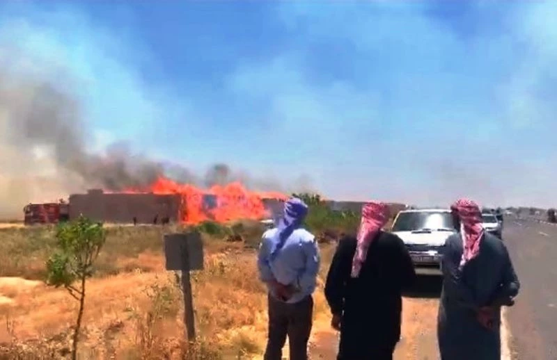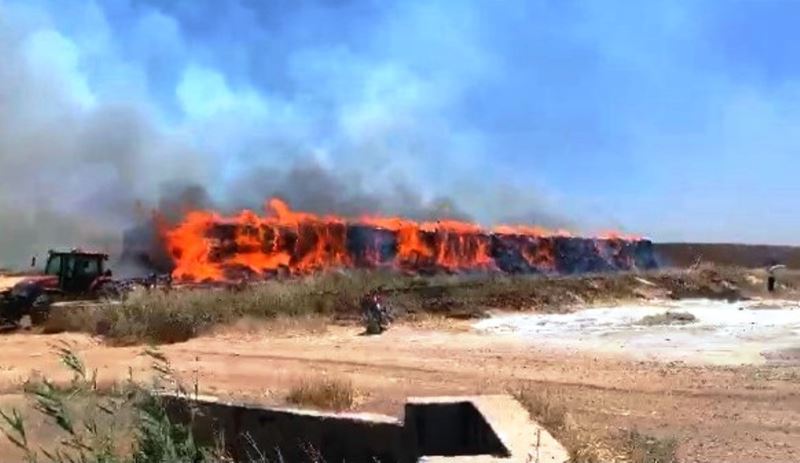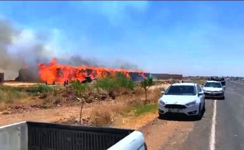 Şanlıurfa’nın Harran ilçesinde anız yangını sonrası kıvılcımların sıçradığı tonlarca saman kül oldu.
