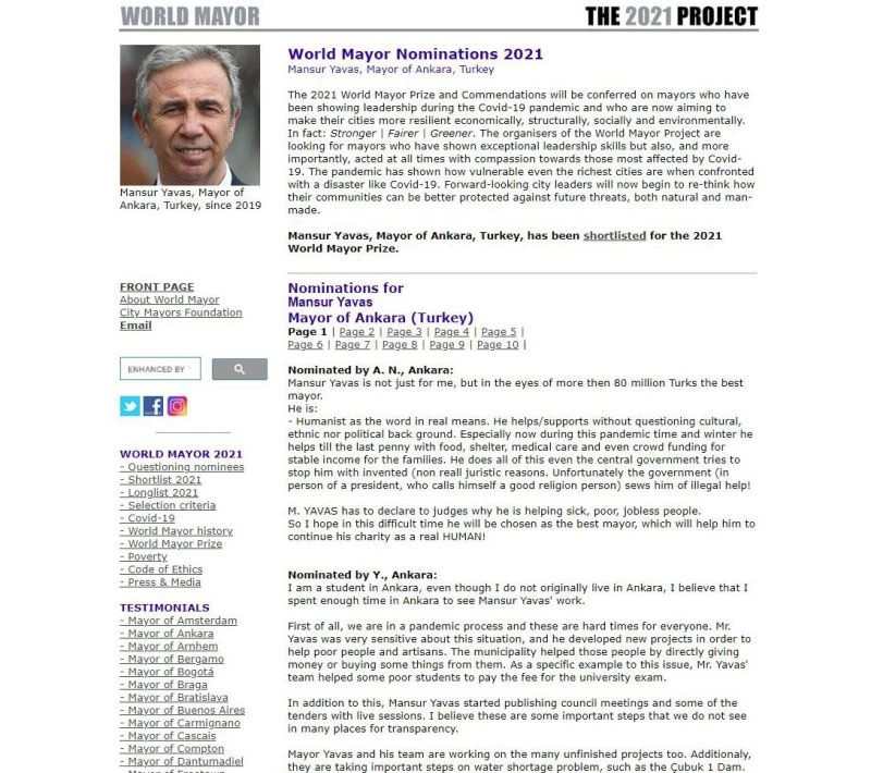 Ankara Büyükşehir Belediye Başkanı Mansur Yavaş, Başkent’te vatandaşların hayatını kolaylaştıran projeler başta olmak üzere şeffaf yönetim uygulamaları ve özellikle de pandemi sürecinde toplum sağlığının korunmasına yönelik çalışmaları nedeniyle ‘City Mayors Foundation’ (Belediye Başkanları Vakfı) tarafından düzenlenen World Mayor’da 2021 Dünya Belediye Başkanı Ödülü’ne aday gösterildi. Vakfın açıklamasında Yavaş’ın pandemi dönemindeki hizmetlerinin dünyadaki diğer belediyeler tarafından beğenildiği ve kopyalandığı vurgulandı. “World Mayor” ekibi, Yavaş’ın finale kaldığını oy verenlerine gönderdiği bir e-posta ile şu ifadeleri kullanarak duyurdu: