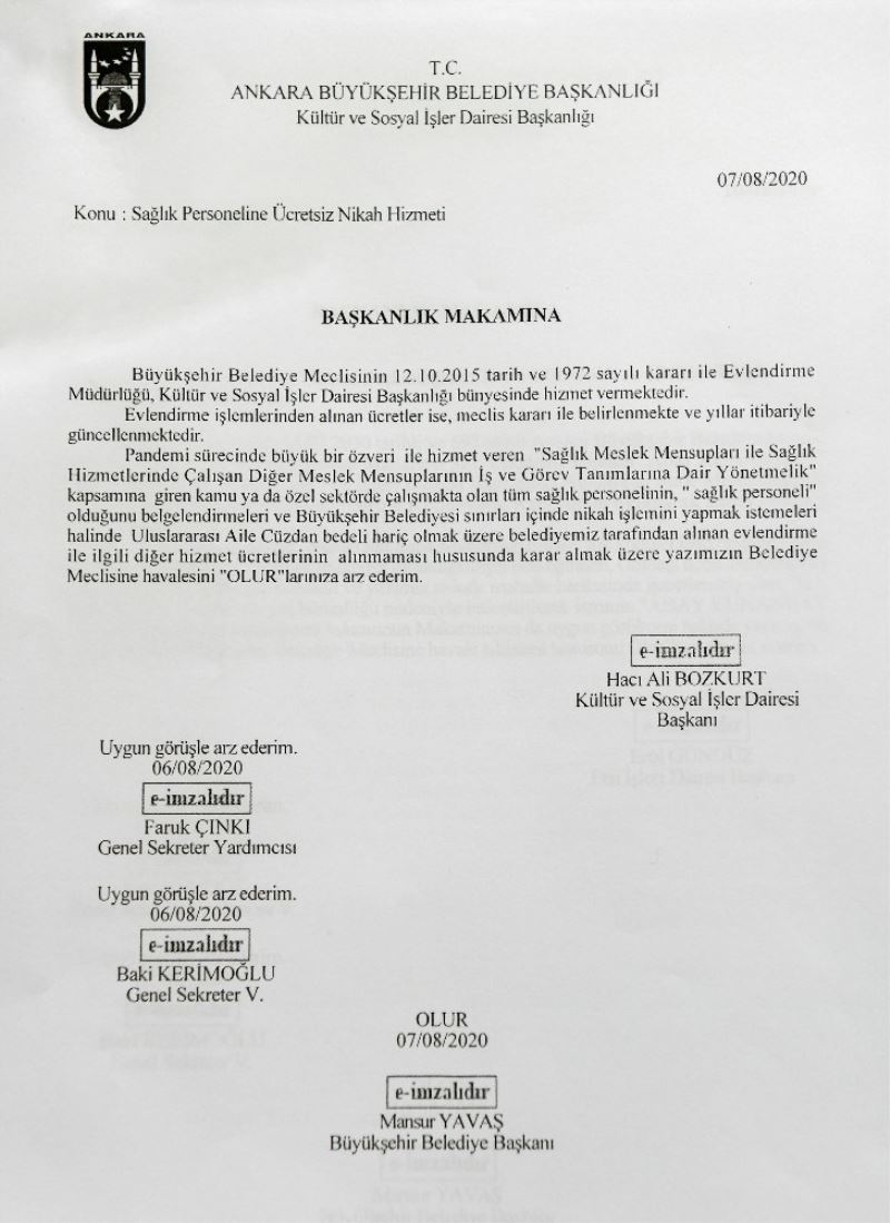 Ankara Büyükşehir Belediyesi pandemi sürecinde özveriyle çalışan sağlık personeline nikah ücreti jesti yaptı. Büyükşehir Belediye Meclisinde gündeme gelen Başkanlık yazısı oy birliği ile kabul edilirken, uluslararası aile cüzdanı ücreti hariç evlendirme ile ilgili diğer ücretler bundan sonra kamu ve özel sektörde çalışan sağlık çalışanlarından alınmayacak.