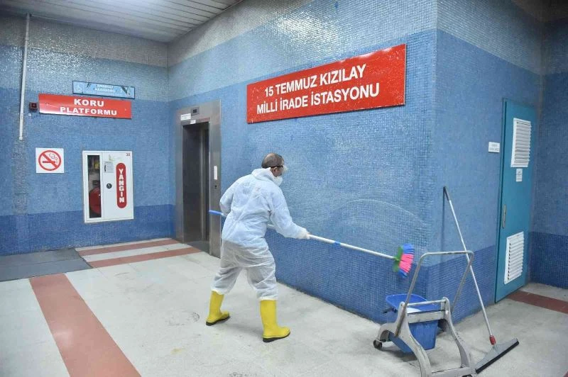 Ankara Büyükşehir Belediyesi, Başkent’te Covid-19 salgınıyla mücadele kapsamında toplu ulaşım araçlarında dezenfeksiyon çalışmalarına ara vermeden devam ediyor. EGO Genel Müdürlüğü temizlik ekipleri, okulların açılması ve kış mevsimi öncesi Metro ve ANKARAY İstasyonlarında geniş kapsamlı temizlik ve dezenfeksiyon çalışması gerçekleştiriyor.