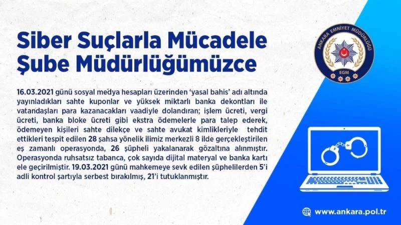 Ankara Emniyet Müdürlüğü’nün Twitter üzerinden yaptığı paylaşımda, “Siber Suçlarla Mücadele Şube Müdürlüğümüzce 16 Mart 2021 günü sosyal medya hesapları üzerinden ‘yasal bahis’ adı altında yayınladıkları sahte kuponlar ve yüksek miktarlı banka dekontları ile vatandaşları para kazandıracakları vaadiyle dolandıran; işlem ücreti, vergi ücreti, banka bloke ücreti gibi ekstra ödemelerle para talep ederek, ödemeyen kişileri sahte dilekçe ve sahte avukat kimlikleriyle tehdit ettikleri tespit edilen 28 şahsa yönelik ilimiz merkezli 8 ilde gerçekleştirilen eş zamanlı operasyonda 26 şüpheli yakalanarak gözaltına alınmıştır. Operasyonda ruhsatsız tabanca, çok sayıda dijital materyal ve banka kartı ele geçirilmiştir. 19.03.2021 günü mahkemeye sevk edilen şüphelilerden 5’i adli kontrol şartıyla serbest bırakılmış, 21’i tutuklanmıştır” denildi.