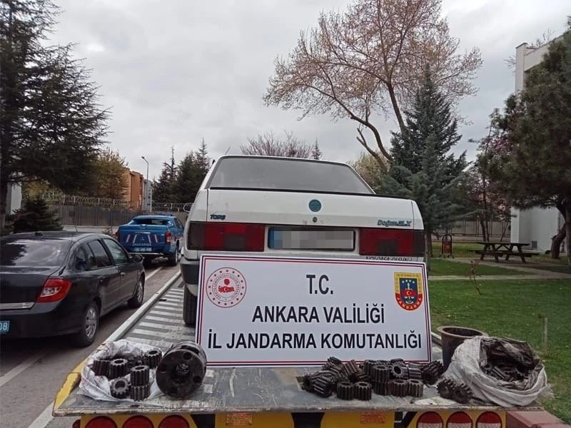 Ankara İl Jandarma Komutanlığı ekipleri, 26 Nisan tarihinde Yenimahalle Hurdacılar Sitesi’nde bulunan bir iş yerinden hırsızlık yapıldığı ihbarı üzerine olay yerine intikal etti. Olay yerinde yapılan inceleme ve araştırma neticesinde 4 şüphelinin 20 ADZ plakalı araç ile kaçtıkları tespit edildi. Bulunan 20 ADZ plakalı araç sürücüsünün dur ihtarına uymayarak kaçması üzerine kovalamaca yaşandı. Kısa süreli takip sonucunda durdurulan araçtaki 2 şüpheli yaya olarak kaçarken, Y.T. ve B.K. yakalandı. Araçta yapılan aramada bahse konu hırsızlık olayında çalınan 400 kilogram metal makine dişlileri ele geçirildi. Yakalanan Y.T. ve B.K. hakkında adli işlem başlatılırken, olay yerinden kaçan 2 şüpheliyi yakalamak için çalışmalar sürüyor.
