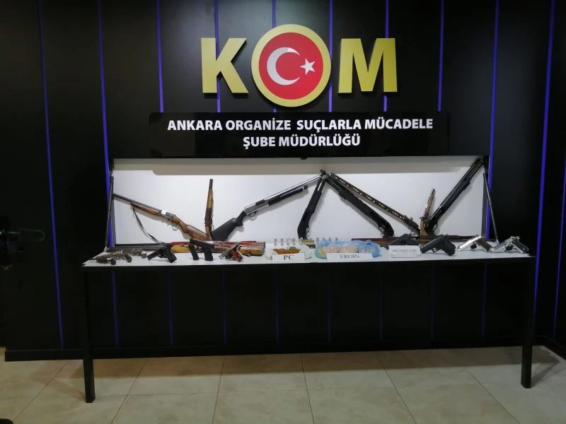Ankara Emniyet Müdürlüğü Organize Suçlarla Mücadele Şubesi ekipleri, il dışından getirdikleri yüklü miktardaki uyuşturucu maddeleri ve silahları piyasaya sürerek haksız kazanç elde eden ve aralarında rant kavgasından dolayı husumet bulunan iki farklı organize suç çetesini çökertmek üzere operasyon için düğmeye bastı. Ekipler, Ankara merkezli Diyarbakır, Gaziantep, Balıkesir ve Çankırı illerinde 58 farklı ikamete düzenledikleri eş zamanlı operasyonla 38 şüpheliden 29’unu yakalayarak gözaltına aldı. Firari şahısların yakalanmasına yönelik çalışmaların ise devam ettiği belirtildi. Şüphelilerin adreslerinde yapılan aramalarda 9 adet ruhsatsız tabanca, 12 adet ruhsatsız av tüfeği, çok sayıda değişik çapta fişek ve kartuş, 1 buçuk kilogram eroin, 200 gram metamfetamin, 500 gram PC, 2 gram esrar ve 35 adet uyuşturucu hap ele geçirildi.