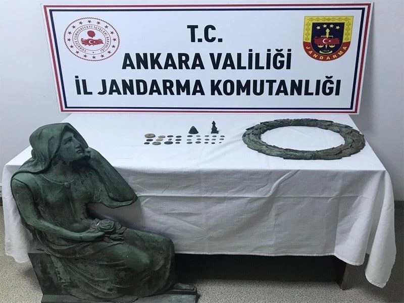 Ankara İl Jandarma Komutanlığının yaptığı operasyonda ele geçirilen tarihi eserlere Anadolu Medeniyetleri Müzesine teslim edilmek üzere el konmuş, yakalanan U.A. ve S.D. adlı şahıslar hakkında adli işlemlere başlatıldı.