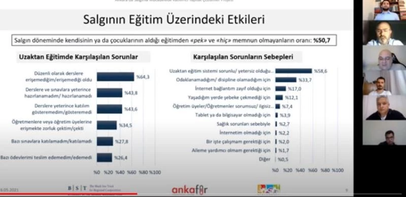 Prof. Dr. Emre Erdoğan anket sonuçlarına göre, Ankara’da yaşayan insanların yüzde 59’luk kesiminin salgından ekonomik olarak olumsuz etkilendiğini tespit ettiklerini, katılımcıların sadece yüzde 9’unun ise rahatça yaşamak için yeterli geliri olduğunu söyledi. Zoom toplantısında ayrıca anketle elde edilen önemli bir diğer verinin ise salgın döneminde her 4 katılımcıdan birinin borç aldığını ortaya çıkardığına dikkat çekildi.