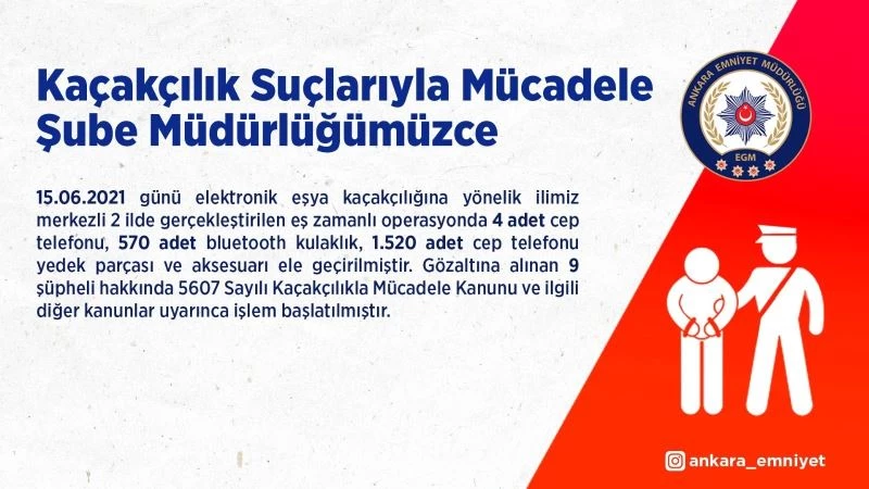 Ankara Emniyet Müdürlüğü Kaçakçılık Suçlarıyla Mücadele Şube Müdürlüğü tarafından eşya kaçakçılığına yönelik Ankara merkezli 2 ilde gerçekleştirilen eş zamanlı operasyonda, 4 adet cep telefonu, 570 adet bluetooth kulaklık, bin 520 adet cep telefonu yedek parçası ve aksesuarı ele geçirildi. Gözaltına alınan 9 şüpheli hakkında kanunlar uyarınca işlem başlatıldı.