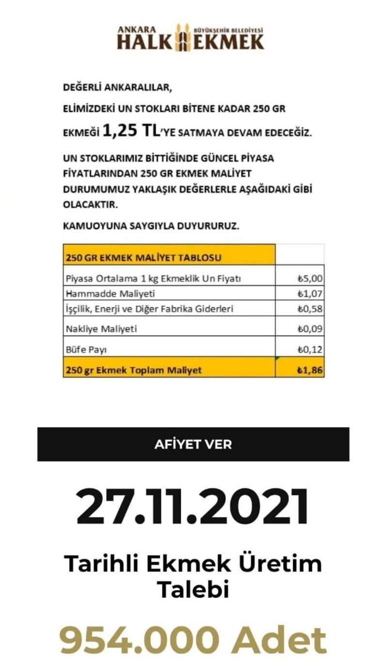 Ankara Halk Ekmek ve Un Fabrikası, sosyal paylaşım sitesi Twitter hesabı üzerinden yaptığı paylaşımda, “Değerli Ankaralılar, emimizdeki un stokları bitene kadar 250 gr ekmeği 1.25 TL’ye satmaya devam edeceğiz. Un stoklarımız bittiğinde güncel piyasa fiyatlarından 250 gr ekmek maliyet durumumuz yaklaşık değerlere aşağıdaki gibi olacaktır” dedi.