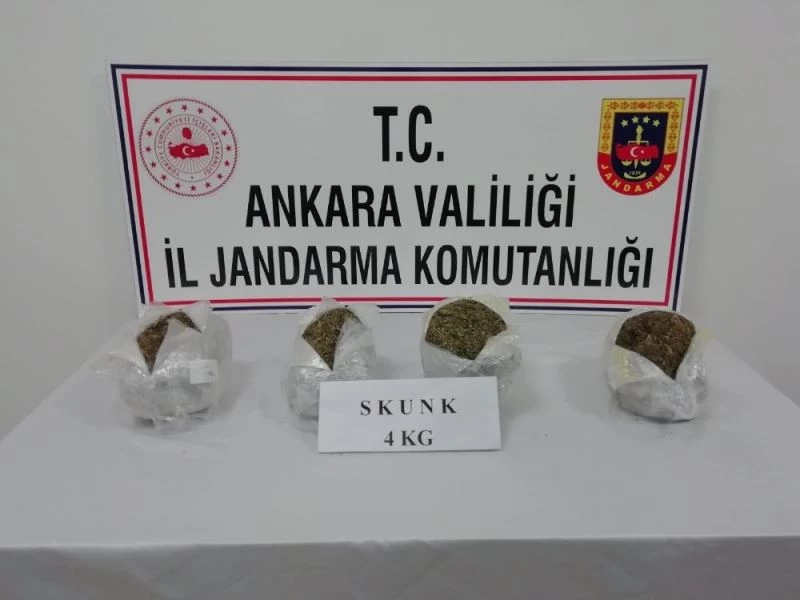 Ankara’da jandarma ekipleri, 3 şüpheli şahıs ve bir araçta yapılan arama neticesinde, 4 kilogram skunk uyuşturucu maddesi ele geçirdi.