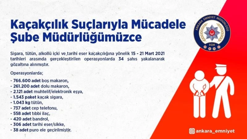 Ankara İl Emniyet Müdürlüğü Kaçakçılık Suçlarıyla Mücadele Şube Müdürlüğü polis ekiplerince gerçekleştirilen operasyonlarda 34 şüpheli gözaltına alındı. Düzenlenen operasyonda ayrıca, 766 bin 600 adet boş makaron, 261 bin 200 adet dolu makaron, 2 bin 121 adet muhtelif/elektronik eşya, bin 543 paket kaçak sigara, bin 43 kilogram tütün, 737 adet cep telefonu, 558 adet tıbbı ilaç, 420 adet bandrol, 306 adet tarihi eser/sikke ve 38 adet puro da ele geçirildi.