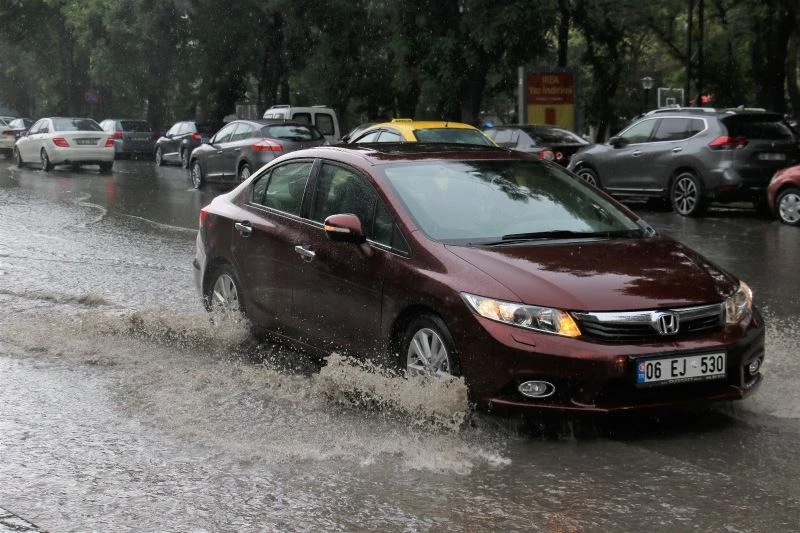 Ankara’da öğle saatlerinde aniden bastıran sağanak yağmur hayatı olumsuz etkilerken, birçok binanın bordum katlarını su bastı.