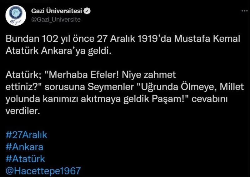 Ankara’da bulunan üniversiteler, Gazi Üniversitesi öncülüğünde sosyal medyada birbirini etiketleyerek, Atatürk’ün Ankara’ya gelişinin 102. yıl dönümünü kutladı.