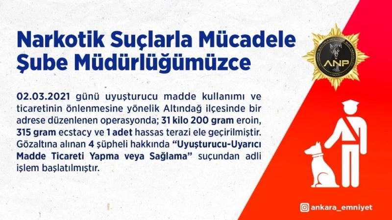 Ankara Emniyet Müdürlüğü’ne bağlı Narkotik Suçlarla Mücadele Şube Müdürlüğü’nce yapılan operasyonda 4 kişi yakalanırken, 31 kilogram eroin ele geçirildi. Ankara Emniyet Müdürlüğü’nün Twitter hesabından yaptığı paylaşımda, “02.03.2021 günü uyuşturucu madde kullanımı ve ticaretinin önlenmesine yönelik Altındağ ilçesinde bir adreste düzenlenen operasyonda 31 kilogram 200 gram eroin, 315 gram ecstacy ve 1 adet hassas terazi ele geçirilmiştir. Gözaltına alınan 4 şüpheli hakkında ‘Uyuşturucu-Uyarıcı Madde Ticareti Yapma veya Sağlama’ suçundan adli işlem başlatılmıştır” denildi.