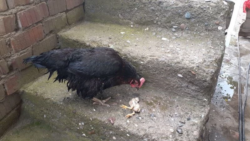 Çorum’un Osmancık ilçesinde şiddetli yağış nedeniyle su basan evde ölen yavrusunun başında bekleyen anne tavuk, görenleri duygulandırdı.