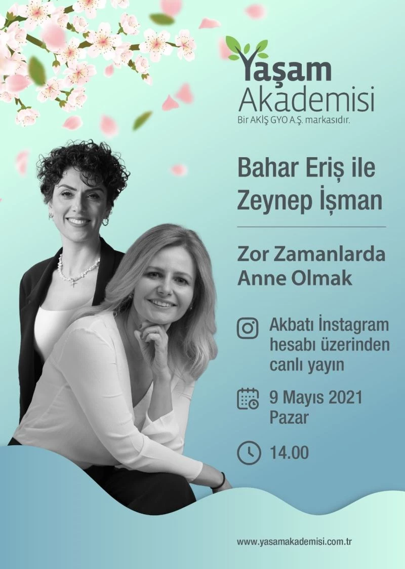 Akbatı, Yaşam Akademisi söyleşileri kapsamında Anneler Günü’ne özel olarak pandemi döneminde anneler ve anne adaylarının yaşadığı zorluklar ve bu sürece özel önerilerin aktarılacağı online söyleşi düzenliyor. Yazar ve Eğitimci Dr. Bahar Eriş ile Gazeteci ve Eğitim Koçu Zeynep İşman’ın katılımıyla ‘Zor Zamanlarda Anne Olmak’ başlıklı söyleşi Akbatı’nın Instagram hesabı üzerinden 9 Mayıs Pazar günü saat 14.00’da gerçekleştirilecek. Canlı yayınla gerçekleşecek söyleşiye tüm anneler ve anne adayları ücretsiz olarak davetli olacak.