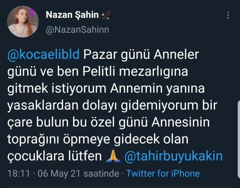 Kocaeli’nin Darıca ilçesi Kazımkarabekir Mahallesi’nde ikamet eden Nazan Şahin adlı genç kadın, 37 yaşında kalp krizi geçirerek hayatını kaybeden annesi Arzu Şahin’in mezarını korona virüs kısıtlamaları sebebiyle uzun süredir ziyaret edemedi. Kısıtlamalarda evinden çıkamayan Nazan Şahin, Anneler Günü’nde annesinin mezarını ziyaret etmek için sosyal medya üzerinden Kocaeli Büyükşehir Belediye Başkanı Tahir Büyükakın’a, "Pazar günü Anneler Günü ve ben Pelitli Mezarlığına gitmek istiyorum, annemin yanına. Yasaklardan dolayı gidemiyorum bir çare bulun. Bu özel günü, annesinin toprağını öpmek için gidecek çocuklara lütfen" diye mesaj atarak yardım istedi. Şahin’in mesajını görerek talebi gerçekleştirmek için çalışma başlatan Başkan Büyükakın, Şahin’in adresine belediye ekiplerini gönderdi. Belediye ekiplerince evinden araçla alınan Şahin, Gebze Pelitli Mezarlığı’nda bulunan annesinin mezarına götürüldü. Belediye ekiplerinin de yardımıyla annesinin mezarını temizleyerek çiçeklerle süsleyen Nazan Şahin, genç yaşta kaybettiği annesinin mezarı başında dua etti. Şahin, mezar ziyareti için kendisine yardımcı olan Kocaeli Büyükşehir Belediye Başkanı Tahir Büyükakın ve belediye ekiplerine teşekkür etti.