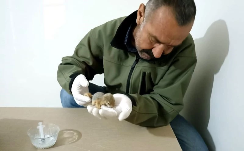 Adıyaman’da annesi otomobilin altında kalarak ölen yavru sincap görevliler tarafından şırınga ile besleniyor.