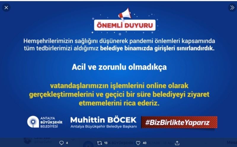 Antalya Büyükşehir Belediye Başkanı Muhittin Böcek’in Covid-19 testinin pozitif çıkmasının ardından belediye girişlerinde sınırlandırılmaya gidildi. Büyükşehir Belediyesi sosyal medyadan vatandaşlara, ‘Acil ve zorunlu olmadıkça vatandaşlarımızın işlemlerini online olarak gerçekleştirmelerini ve geçici bir süre belediyeyi ziyaret etmemelerini rica ederiz” uyarısında bulundu.