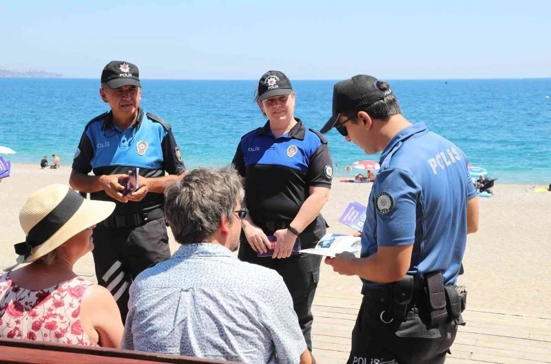 Antalya Emniyet Müdürlüğü personeli, yerli yabancı binlerce kişinin zaman geçirdiği Konyaaltı Sahili’nde vatandaşları boğulma ve güvenlik tedbirleri konusunda bilgilendirdi.