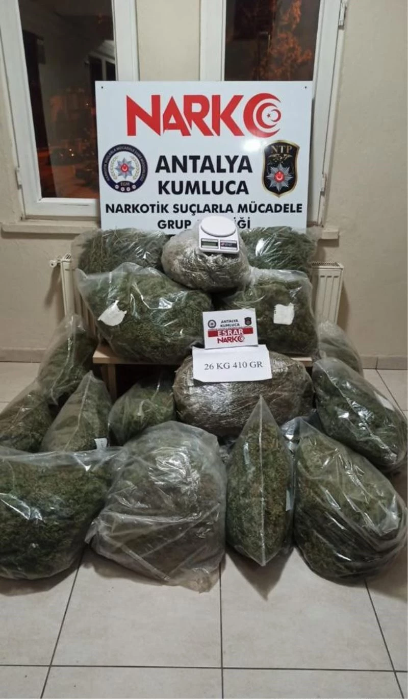 Edinilen bilgiye göre, Kumluca İlçe Emniyet Müdürlüğü Narkotik Suçlarla Mücadele Grup Amirliği uyuşturucu madde ticareti yapan şahıs ve gruplara yönelik olarak çalışma başlattı. Yapılan çalışmalar neticesinde tespit edilen adreslere operasyon yapılarak 18 parça halinde çuval ve şeffaf poşetlere sarılı 26 kilo 410 gram esrar maddesi ile uyuşturucu tartımında kullanılan 1 adet hassas terazi ele geçirildi.